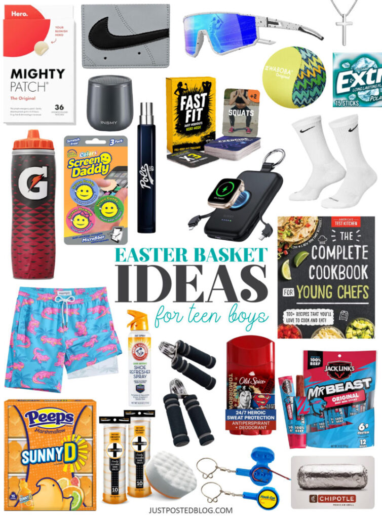 Mighty Patch Zit Patches | N ike Wallet | Sunglasses | Cross Necklace | Mini Portable Bluetooth Speaker | Fitness Cards | Water Ball | Gum | Water Bottle | Screen Daddy Cleaners | Polo Mini Cologne | Portable Charger | N ike Socks | Swim Trunks 7″ • Swim Trunks 5″ | Shoe Refresher Spray | Hand Grip Strengtheners | Deodorant | The Complete Cookbook for Young Chefs | Sunny D Peeps | Sneaker Cleaners | Hook Eez for fishing Hooks | Beef Sticks | Chipotle GC