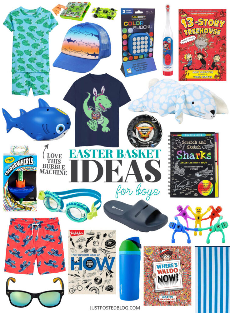 PJ Set | Car Launcher | Hat | Light Up Color Sudoku Game | Toothbrush | 13 Story Treehouse Book | Shark Bubble Machine | T-Rex Easter Tee | Weighted Stuffed Bunny • More HERE | Mini Monster Truck | Scratch and Sketch Shark Book | Colorwhirls Tops | Dinosaur Goggles | Slides | Magnetic Robots | Lobster Swim Trunks | Sunglasses | The Highlights Book of How | 0wala | Where’s Waldo Now? | Striped Towel