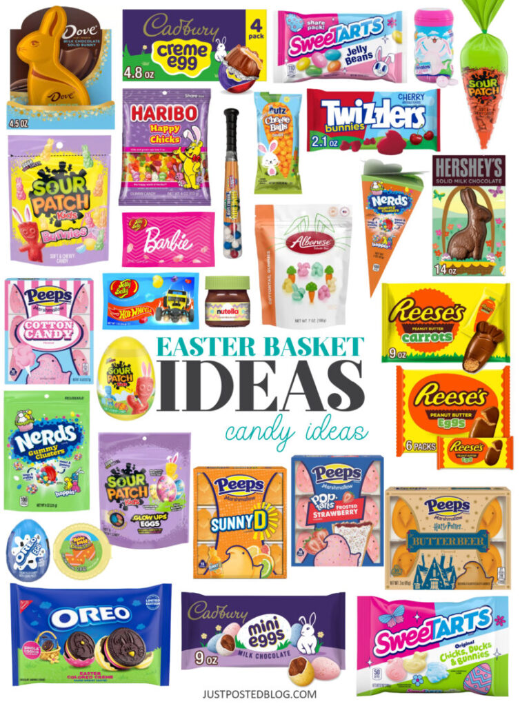 Dove Chocolate Bunny | Cadbury Creme Eggs | SweetTart Jelly Beans | Mentos Gum | Sour Patch Carrot | Sour Patch Bunnies | Happy Chicks | Barbie Jelly Beans | Hot Wheel Jelly Beans | Mini Nutella | Albanese Easter Gummies | Bubble Gum Bat | Cheese Balls | Twizzler Bunnies | Nerd Gummy Clusters Carrot | Hershey Bunny | Cotton Candy Peeps | Reese Carrots | Reese Eggs | Nerd Hoppin Gummy Clusters | 0reo Egg | Hubba Bubba Gum | Sour Patch Glow Eggs | Sunny D Peeps | Strawberry Pop Tart Peeps | Harry Potter Peeps | Oreo Eggs | Cadbury Mini Eggs | Sweetart Chicks, Ducks & Bunnies